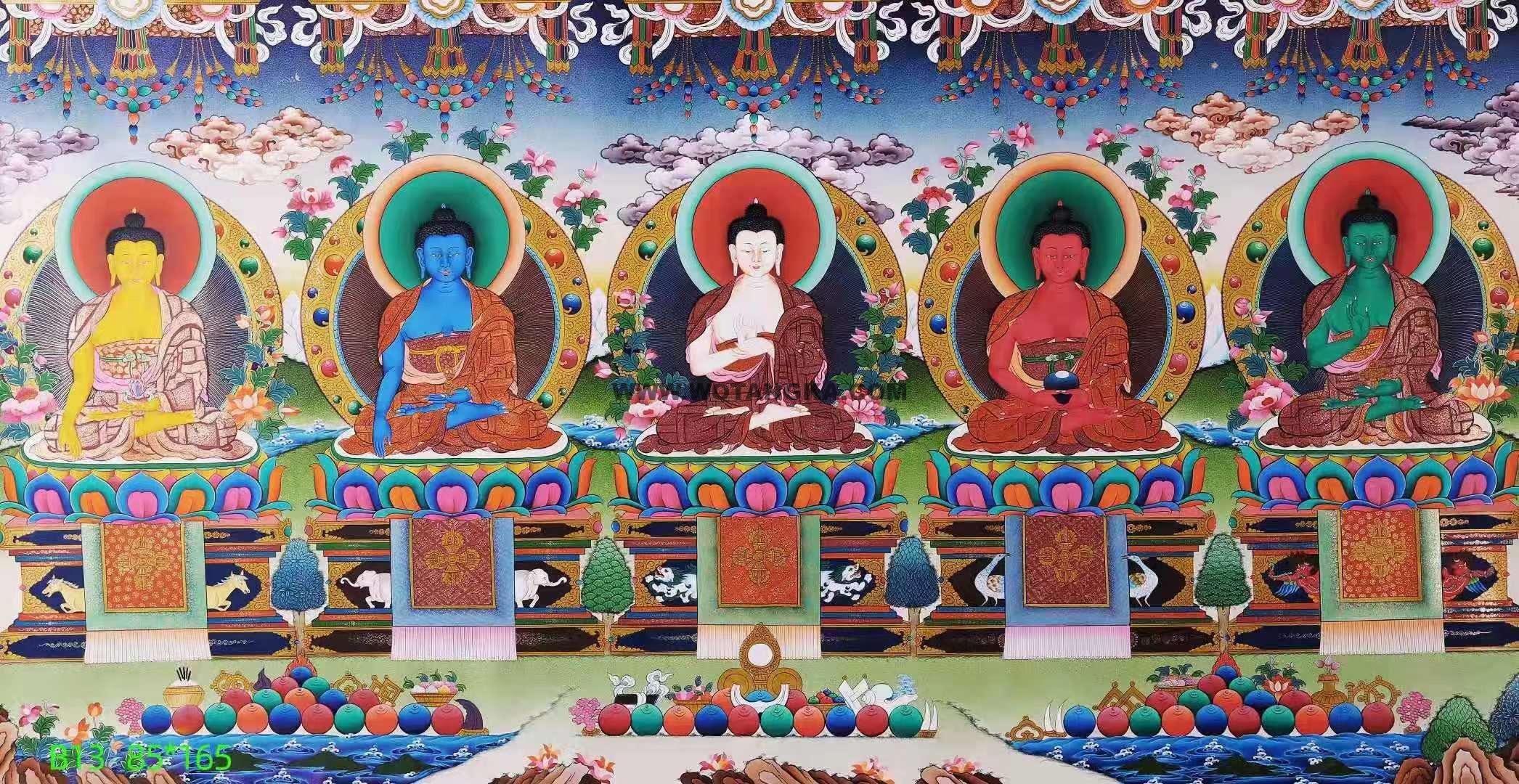 五方佛,又称”五智佛”、”五智如来”横幅 尼泊尔画师力作纯手绘布本唐卡【药师佛】。作品采用金粉混合天然颜料纯手绘而成。作品主尊宝相传神。布图干净精美、画工非常的细腻,严格的遵照佛经的度量仪轨如法绘制,期待有缘人。