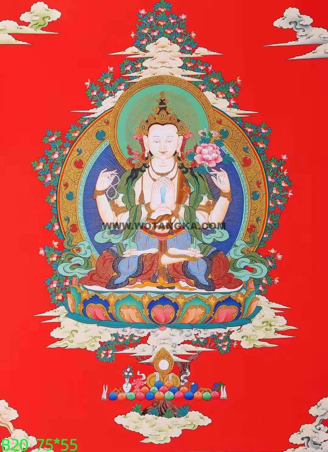 四臂观音是雪域西藏的守护神,藏人由老至幼家家户户,皆吟诵其六字大明咒:“嗡嘛呢叭咪吽”。四臂观音与文殊菩萨、金刚手菩萨,合称三族姓尊,代表大悲、大智、大力,为密乘行者人人必修的法门。