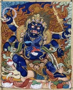 玛哈嘎拉是梵语,译为大黑天,即”怙主”之意,为上师、本尊、护法三根本之护法神,是佛教三根本的化身。其为调伏刚强众生而呈现忿怒相,本尊及眷属护法众除护持佛法外,依缘起多示现为两臂、四臂、六臂黑、白等形象,为藏传佛教诸宗共同推崇的智慧护法,是藏传佛教中最重要的护法神之一。