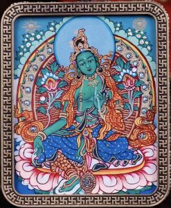 绿度母为观世音菩萨的化身。度母,梵名Tara,全称圣救度佛母,我国古代称多罗菩萨、多罗观音,度母有许多不同的化现,包括有二十一度母、五百度母等等,皆为观世音菩萨之化身,而绿度母为所有度母之主尊,总摄其余二十尊化身之所有功德。