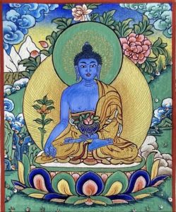 药师琉璃光如来是东方净琉璃世界之教主。此佛于过去世行菩萨道时,曾发十二大愿,愿为众生解除疾苦,使具足诸根,趋入解脱,故依此愿而成佛。住净琉璃世界,其国土庄严,如极乐国。日光遍照菩萨与月光遍照菩萨同为药师佛的二大胁士。法相所现为螺发形,左手持药壶,右手结施无畏印(或与愿印),日光、月光二菩萨胁侍左右,并称为药师三尊。