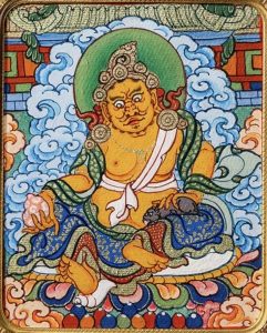 黄财神在象雄文中称为“占巴拉”,藏文叫做“诺拉”,翻译成汉文叫做“财神”。 藏名叫作“占巴拉色波”或“藏色”,他的色肤是黄色,故称为黄财神。黄财神为藏地各大教派尊奉的五色财神之一,黄财神在密宗教法中,属于财神也是护法神,五色财神之一。