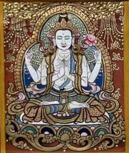 藏传佛教“三怙主”中的观音像为四臂观音像。四臂观音,藏语称“奇木格”,在藏传佛教寺院壁画、雕塑中常见的四臂观音有两种相状:寂静像和忿怒像。