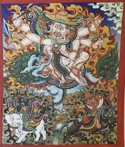 白哈尔意之王,又称意明王护法,本名帝释。他位处中央,是主神,有时也有白哈尔本身居中的形式。他一身蓝黑色,一面二手,呲牙咧嘴,右手持绳套,左手执利刃,身着熊皮外套和黑丝披风,头戴黑丝头饰,骑一头长鼻白象。他的前面有门普布查牵象和大夜叉命主杨来白骑马导引。他的明妃叫响帝若散玛。