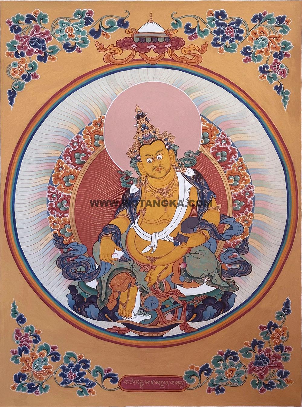 黄财神是藏传佛教各大教派普遍供养的五姓财神之一,因其身相黄色,故称黄财神。修持黄财神法、持诵其密咒,可获得黄财神庇佑,能增长福德、寿命、智能、物质及精上之受用,不被生活所逼,以及一切经济压迫,可安心向道。但修法者需发无上菩提心,广结善缘,勤行布施。万勿悭贪成性,护法降罪也. 黄财神面慈目善,头戴宝冠,坦胸露腹,戴着珍宝璎珞、珍宝耳环、珍宝手镯和珍宝足钏,上身穿丝制天衣,下身着丝制裙子,右手于右膝上捧喷焰末尼,左手握着吐宝鼬,以威镇坐姿坐在莲花宝座中央。身后有光环、祥云、远山。能增长福德、寿命、智慧、物质及精神上之受用。主司财富,能使一切众生脱于贫困,财源广进。