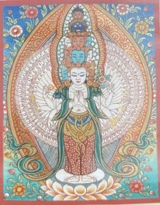观音曾发誓要普度众生,然而众生芸芸,观音颇有力不胜任之感。于是观音分身成四十二个大慈大悲菩萨,意在利益安乐一切众生。观音的师傅无量佛见状,劝其不要急躁,否则欲速则不达。无量佛将四十二个个体撮合在一起,只留下四十二只手臂,又让每只手掌上长出一只眼睛,代表一个化身。这样除去主体的两只手臂,还有四十只手臂,每只手臂各配上佛门三界中的“二十五有”(佛教认为,三界中有二十五种有情存在环境,包括四洲、四意趣、六欲天等),两数相乘为一千。