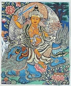 文殊菩萨,又称文殊师利童真、孺童文殊菩萨。为佛教四大菩萨之一。与般若经典关系甚深,故称为大智文殊师利菩萨。