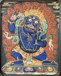 金刚手菩萨另名“秘密主”,在佛教密宗的位阶很高。经载:龙树菩萨入南天铁塔内,所传出的密教圣典,就是金刚手菩萨所集结的;且龙树在此所得之一切密法,亦是金刚手所授与。 金刚手菩萨因手持金刚杵而得名,属金刚部,是大势至菩萨的忿怒化现,与观音、文殊等合为“三族姓尊”,故称大力金刚手。 密教行者在修习任何密法之前,常须先修金刚手,因其能降伏魔扰,护持行者之故。金刚手菩萨,身颜蓝黑色,一头二臂,戴五骷髅冠,三目圆睁,金色须发逆竖。身披天衣,以虎皮为裙。右手高举忿怒印,持金刚杵,左手当胸忿怒印,持金刚索。双足右屈左伸,安立于般若炽焰中之七彩莲花月轮。