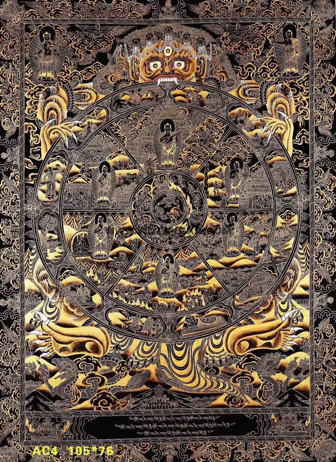 六道轮回图此类唐卡题材较为少见,整个画面是一个巨大的轮,被一位赤色的阎罗法王拥抱着。阎罗法王以獠牙锯齿衔着轮的上部,三目圆睁,五骷髅冠,下部露着明王的双脚和虎皮裙,表示芸芸众生都被佛法统捏着。