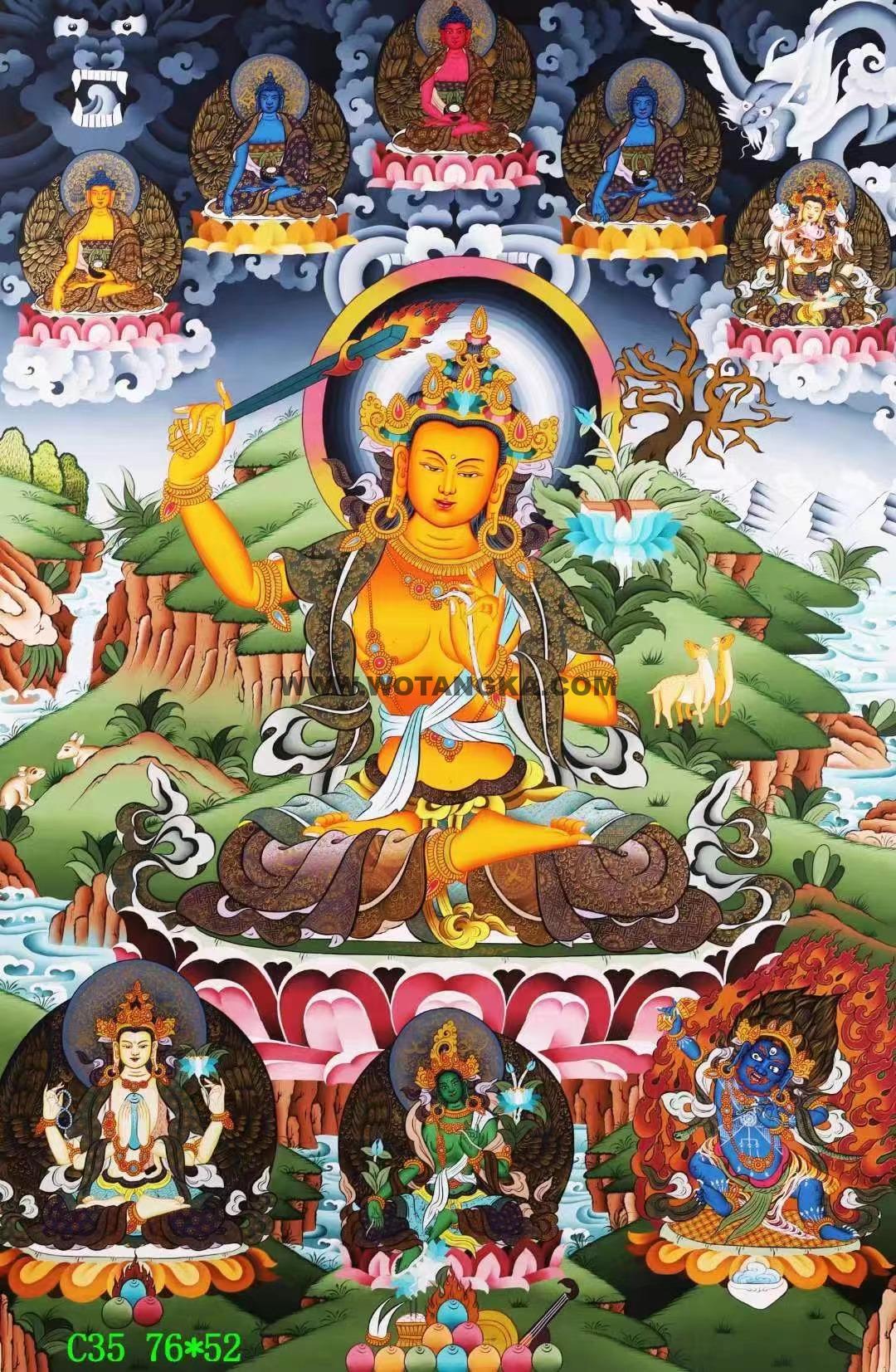 尼泊尔知名唐卡画僧纯手绘布本唐卡【文殊菩萨】,作品采用24K真金金粉混合天然颜料纯手绘而成。作品主尊宝相传神。布图干净精美、画工非常的细腻,严格的遵照佛经的度量仪轨如法绘制,期待有缘人。