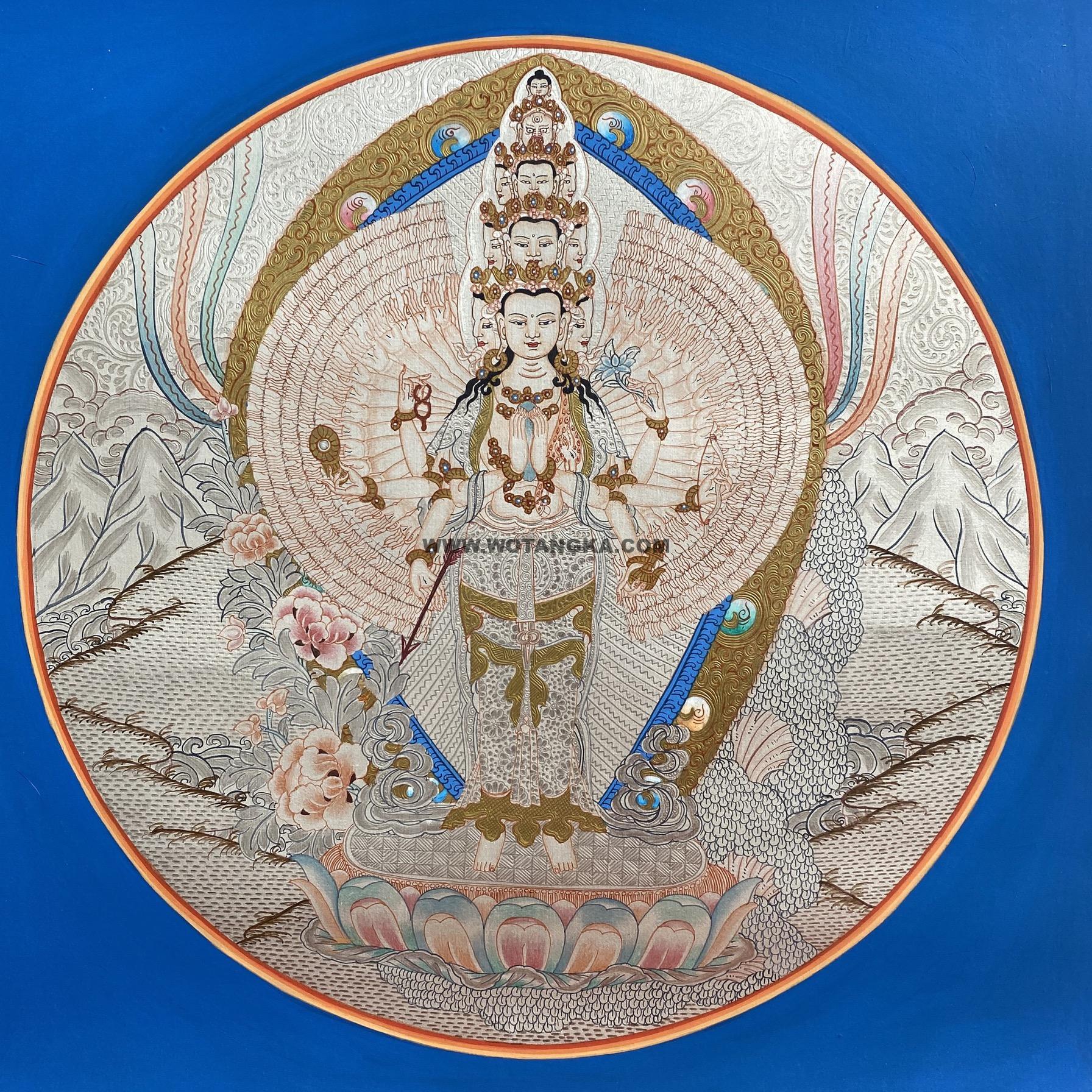 尼泊尔成名喇嘛力作【千手观音】手绘布本唐卡。作品采用银箔打底,用金粉混合矿物颜料纯手绘而成。作品主尊宝相传神。布图精美、画工非常的细腻,严格的遵照佛经的度量仪轨如法绘制,期待有缘人。
