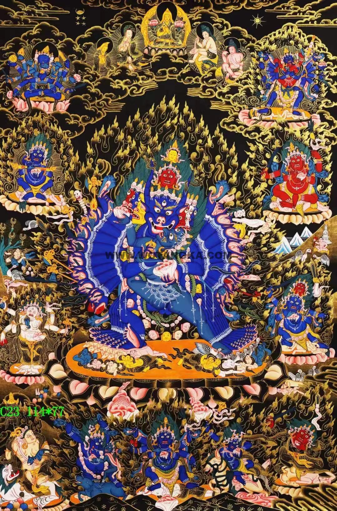 尼泊尔知名唐卡画师手绘力作精品【大威德金刚】 唐卡手绘布本,作品采用采用24K金描线,金粉混合天然颜料纯手绘而成,画工细腻,开脸殊胜,能量极强,严格的遵照佛经的度量仪轨如法绘制,期待有缘人。