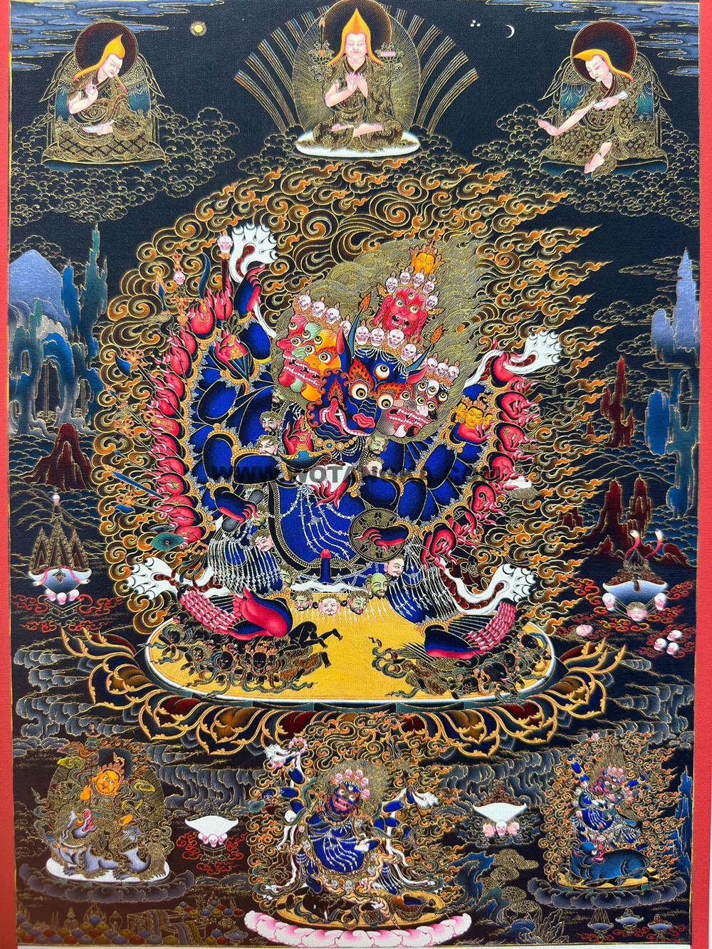 中国唐卡艺术作品中的【大威德金刚】唐卡手绘布本,热贡知名画师索南才旦·画院出品,收藏供奉不要错过。作品主尊宝相传神, 采用天然矿石晕染,纯金描线,画工细腻,殊胜,精美、风格富丽,采用24K真金描绘,画工细腻,开脸殊胜,是一副难得一见的好唐卡作品。