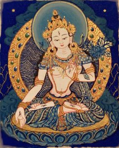 白度母为二十一度母之一,是一切众生尤其是女性的无比圣神,是保佑心想事成,赐寿除障的如意宝。白度母集二十一度母之功德于一身,能消除病痛邪风,妖魔鬼怪等外部之障与贪嗔痴等内部之障,勇猛无比,形随众生,变幻莫测。藏传佛教认为生信者只要一念及,即能以兄弟姐妹之情倾力相助,堪称众女神之王。