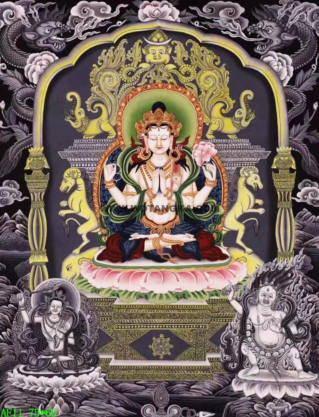 纽瓦立知名唐卡画师力作《四臂观音·三怙主》唐卡手绘布本,画工细腻,开脸殊胜,是一副难得一见的好唐卡作品。
