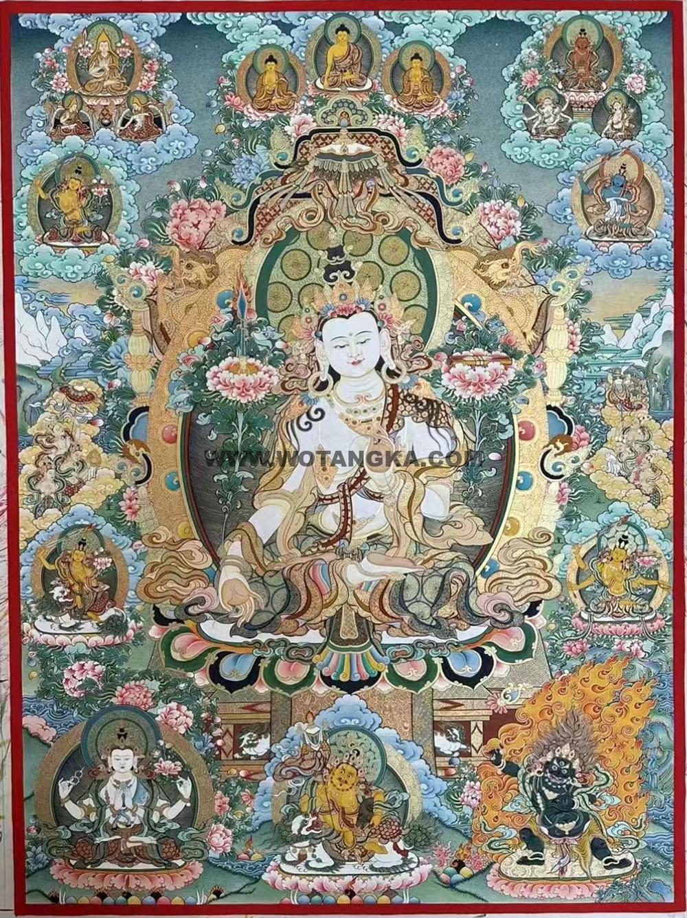 唐卡作品名称:白文殊菩萨吉祥伞盖三佛国净土智慧供养图