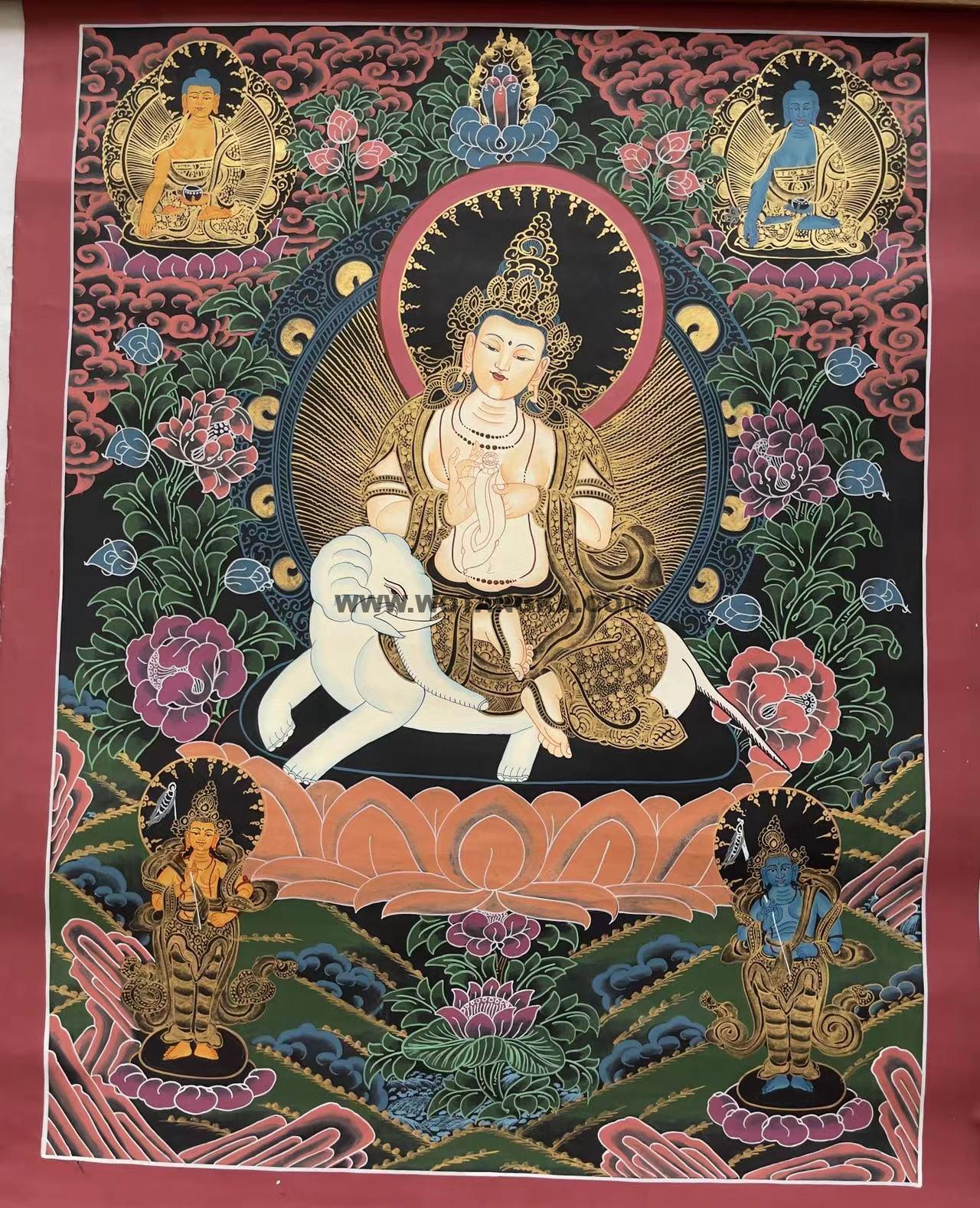 ️尼泊尔画师力作【普贤菩萨】手绘布本唐卡。作品采用金粉混合天然颜料纯手绘而成。作品主尊宝相传神。布图精美、画工非常的细腻,严格的遵照佛经的度量仪轨如法绘制,期待有缘人。