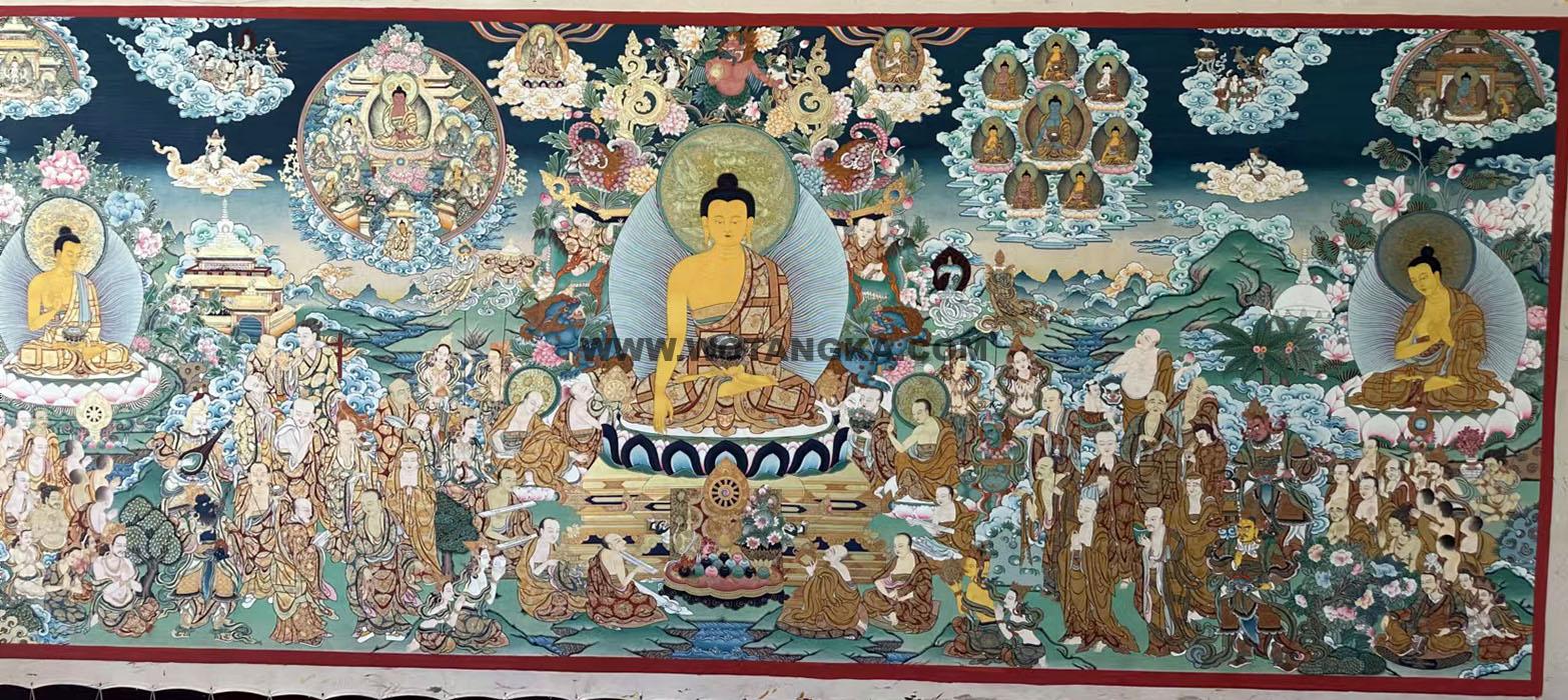 唐卡作品名称:释迦牟尼三世佛净土诸天罗汉听法图