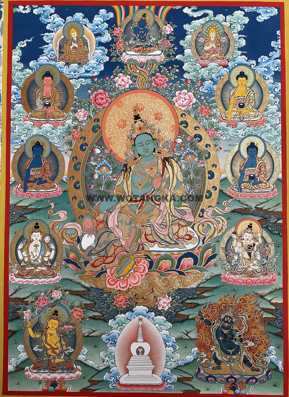 唐卡作品名称:绿度母金刚总持诸佛化现吉祥长寿供养图