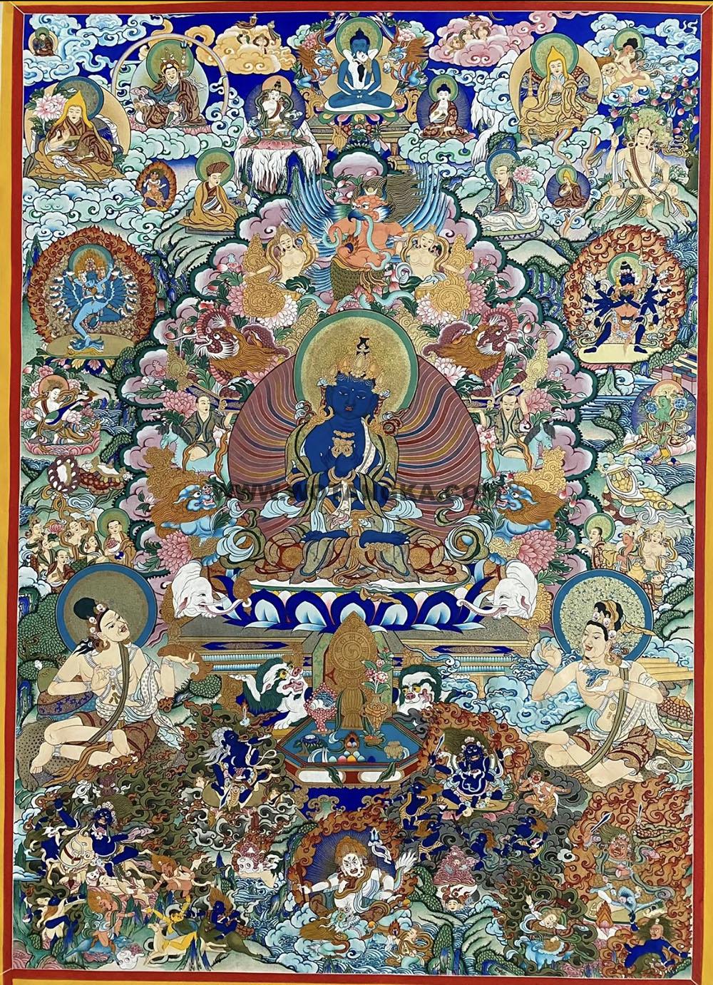 中国唐卡艺术作品中的【金刚总持佛】唐卡手绘布本,热贡知名画师索南才旦·画院出品,收藏供奉不要错过。作品主尊宝相传神, 采用天然矿石晕染,纯金描线,画工细腻,殊胜,精美、风格富丽,采用24K真金描绘,画工细腻,开脸殊胜,是一副难得一见的好唐卡作品。
