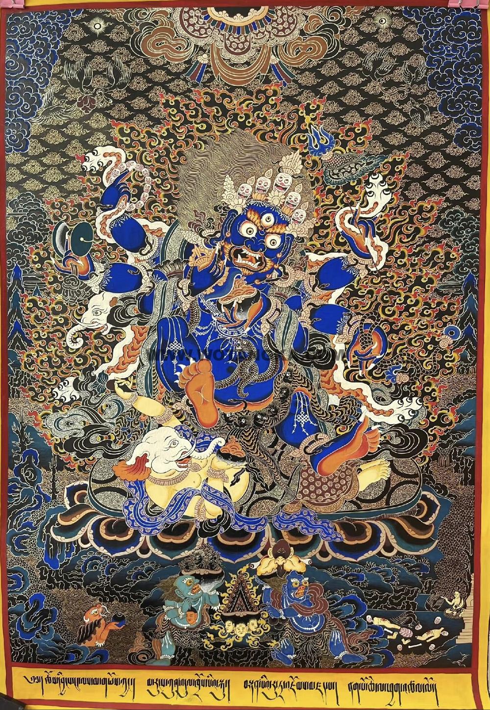 玛哈嘎拉是梵语,译为大黑天,即”怙主”之意,为上师、本尊、护法三根本之护法神,是佛教三根本的化身。其为调伏刚强众生而呈现忿怒相,本尊及眷属护法众除护持佛法外,依缘起多示现为两臂、四臂、六臂黑、白等形象,为藏传佛教诸宗共同推崇的智慧护法,是藏传佛教中最重要的护法神之一。