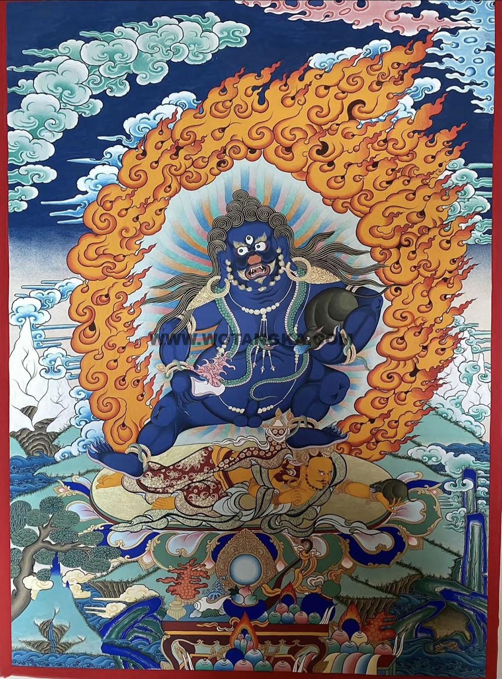 黑财神藏名“藏拉那波”,乃是东方佛里的金刚不动佛。为了利益娑婆众生解脱穷困之苦而化现,在密宗认为,黑财神是五姓财神中施财立即见效的财神,甚至称他为财神王。黑财神乃是五方佛之东方金刚不动佛,为利益娑婆众生摆脱穷困的苦恼所做的化现。 身青黑色,故名。主要功德为驱除所有违缘的纠缠,并使一切善愿都能心想事成,圆满无碍。 此尊身形矮胖,大肚福相,红发黑肤裸体,三目圆睁,发须眉赤红如火,头戴宝冠,以珠宝璎珞、以八龙王为饰,生殖器上竖,辉光靠背,粗体大腹,右手擎盈血颅器于胸,左手捉吐宝鼠,两足以右曲左伸姿威立, 踏于黄色持财天之背,安住莲花月轮座上。修持黑财神法门,可获其庇佑,消除怨敌、偷盗、病魔等障,使诸受用财富增长。