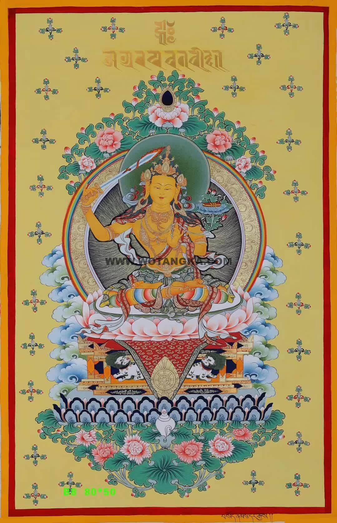 【 安多强巴派精品~文殊菩萨】布达拉宫最后一位宫廷画师,在大山深处流传着自己的画风,被诸多活佛、寺院供为上品。唐卡手绘布本,采用24K真金描线,藏红花植物颜料,纯金拉。天然矿石颜料着色晕染,画工细腻,开脸殊胜,是一副难得一见的好唐卡作品。