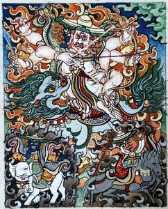 白哈尔功德之王,又称功德明王护法。本名具木鸟形者。它司职南方黄金天宫。他全身也是黑色,一面二臂,右手握战斧,左手持绳套,身穿蛇、虎皮制成的披风,头戴藤编羔皮帽,骑白蹄黑马,旁有龙、猴、猿等曾相伴随行。他的明妃是一面四手的黑色女神色吉布止玛。