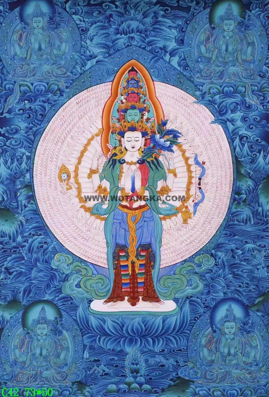 尼泊尔知名唐卡画师作品《千手观音》,作品采用24K真金描线,混合天然颜料纯手绘而成。作品主尊宝相传神,布图干净精美、画工非常的细腻,严格的遵照佛经的度量仪轨如法绘制,期待有缘人。