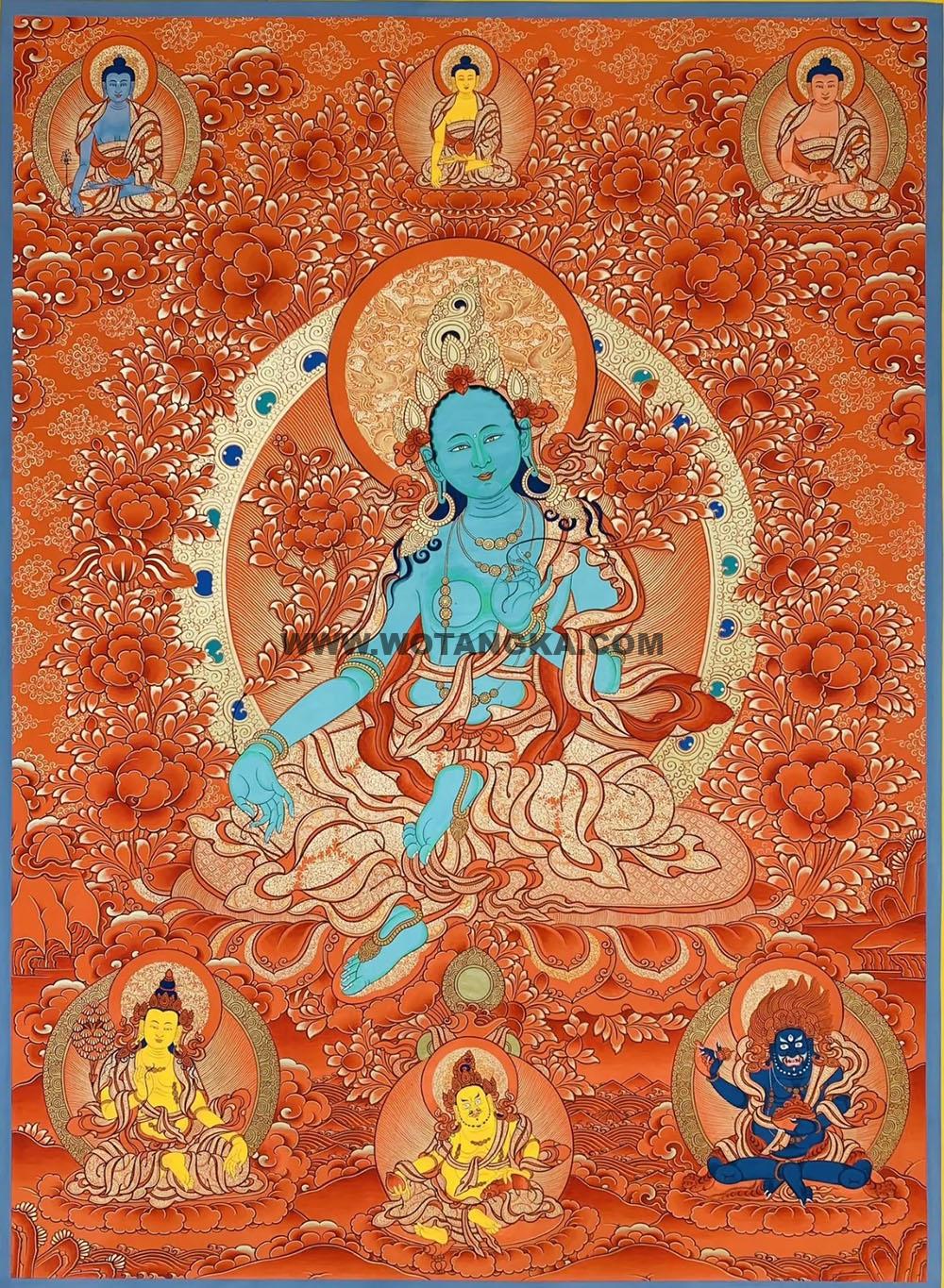 绿度母,梵名Tara,全称圣救度佛母。度母有许多不同的化现,包括有二一度母、五百度母等等,皆为观世音菩萨之化身。相传绿度母是由观世音菩萨的眼泪所化现,为所有度母之主尊,总摄其余二十尊化身之所有功德,是慈悲与绝美的象征。