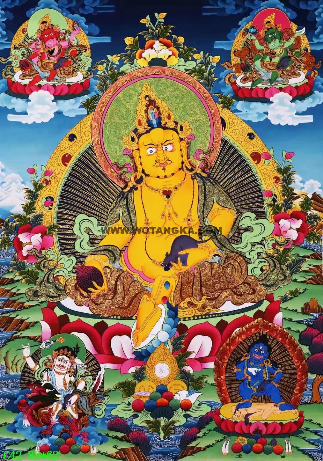 黄财神为北方司财众部之首领,掌无尽宝库,修此法者,可消灭六道穷苦,增长福德、寿命、智慧, 以及一切物质与精神上的受用。心灵上得到满足。黄财神是藏传佛教各大教派普遍供养的五姓财神之一,因其身相黄色,故称黄财神。修持黄财神法、持诵其密咒,可获得黄财神庇佑,能增长福德、寿命、智能、物质及精上之受用,不被生活所逼,以及一切经济压迫,可安心向道。但修法者需发无上菩提心,广结善缘,勤行布施。万勿悭贪成性,护法降罪也. 黄财神面慈目善,头戴宝冠,坦胸露腹,戴着珍宝璎珞、珍宝耳环、珍宝手镯和珍宝足钏,上身穿丝制天衣,下身着丝制裙子,右手于右膝上捧喷焰末尼,左手握着吐宝鼬,以威镇坐姿坐在莲花宝座中央。身后有光环、祥云、远山。能增长福德、寿命、智慧、物质及精神上之受用。主司财富,能使一切众生脱于贫困,财源广进。