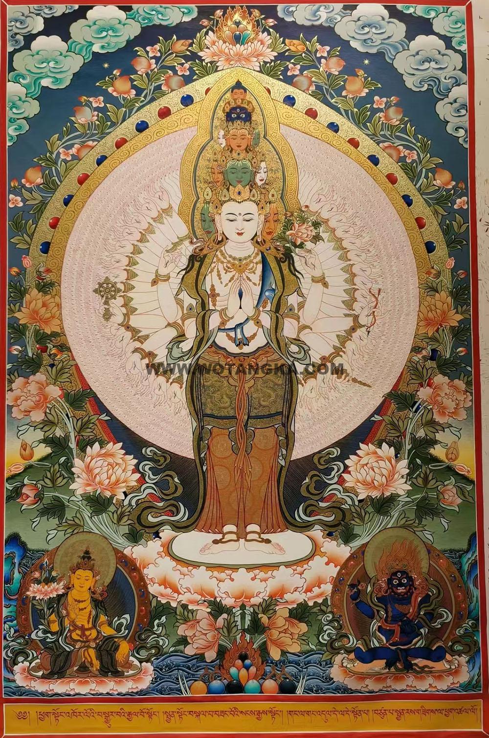 中国唐卡艺术作品中的【千手观音·三怙主】唐卡手绘布本,热贡知名画师东智加·画院出品,收藏供奉不要错过。作品主尊宝相传神, 采用天然矿石晕染,纯金描线,画工细腻,殊胜,精美、风格富丽,采用24K真金描绘,画工细腻,开脸殊胜,是一副难得一见的好唐卡作品。