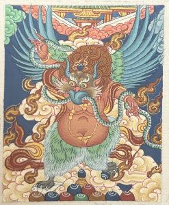 大鹏鸟即是佛教所谓的金翅鸟,是一种有五种神通(神足通,他心通,宿命通,天耳通,天眼通)的飞禽。大鹏金翅鸟出生就具备飞翔的力量,伸展天生坚硬似铁的喙爪,翘着金刚钻石般的角,顶上有奕奕放光的宝珠,火眼如同日月般闪烁,钢铁一般坚固的嘴如铁钩,宛如宝剑般的翅膀在空中舞动,金色利刃的翎羽缝隙中降下热沙雨,居住在大铁树上。以龙为食。这里指的龙也是有五种神通:神足通,他心通,宿命通,天耳通,天眼通。它们此类众生异常凶狠残暴,因此当它死亡时,身上燃起熊熊烈火,不仅将自身所有的血肉骨焚为灰迹,而且能够焚烧周围的一切林园。据说大鹏鸟的心脏是一颗宝珠,死后坠入海底。它每天要吃一个龙王及五百条小龙,因此,它体内积蓄了极重的毒气,到命终时,龙毒发作,上下翻飞七次,飞到金刚山顶上自焚而亡。