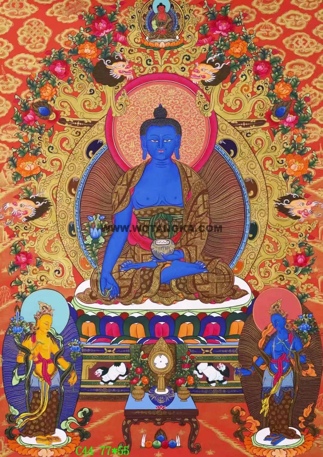 尼泊尔知名唐卡画师作品《药师佛》,作品采用24K真金描线,混合天然颜料纯手绘而成。作品主尊宝相传神,布图干净精美、画工非常的细腻,严格的遵照佛经的度量仪轨如法绘制,期待有缘人。