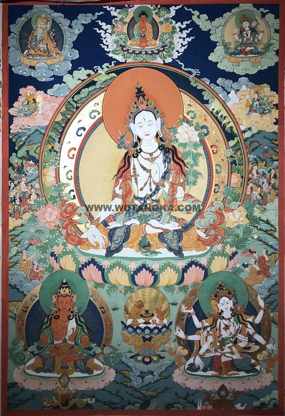 编号188-582143:彩绘唐卡-白度母·长寿三尊(100*70CM左右) | 沃唐卡www.WoTangKa.com