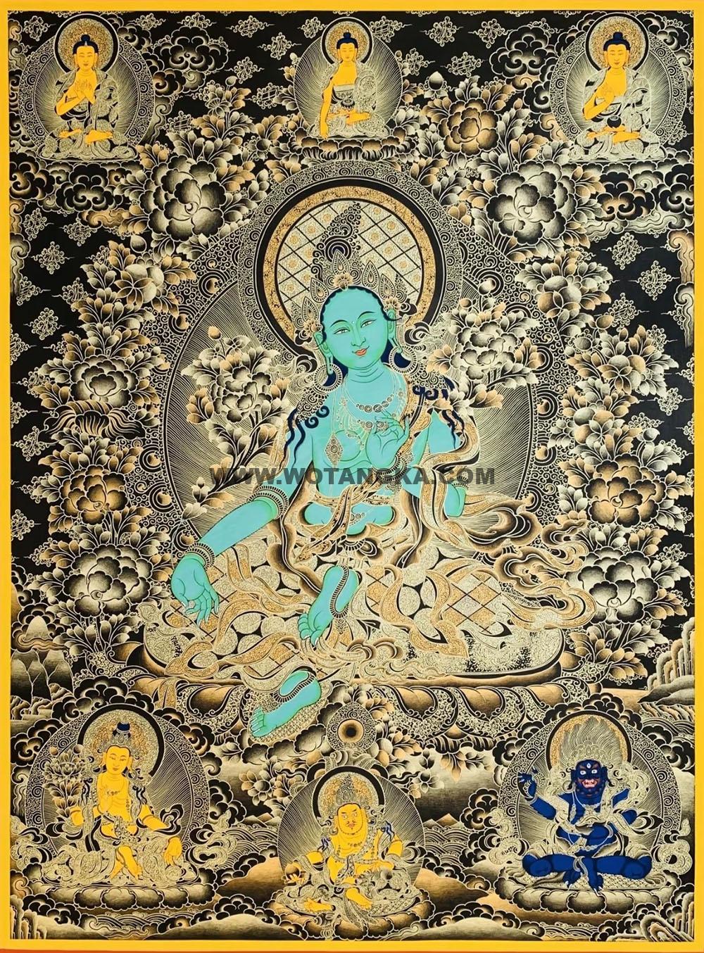 绿度母,梵名Tara,全称圣救度佛母。度母有许多不同的化现,包括有二一度母、五百度母等等,皆为观世音菩萨之化身。相传绿度母是由观世音菩萨的眼泪所化现,为所有度母之主尊,总摄其余二十尊化身之所有功德,是慈悲与绝美的象征。