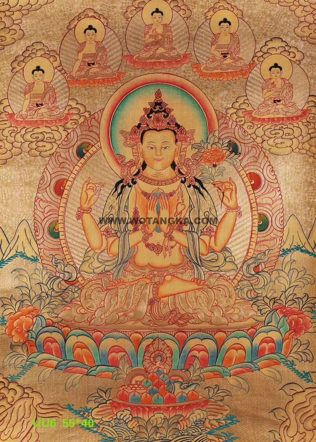 四臂观音是雪域西藏的守护神,藏人由老至幼家家户户,皆吟诵其六字大明咒:“嗡嘛呢叭咪吽”。四臂观音与文殊菩萨、金刚手菩萨,合称三族姓尊,代表大悲、大智、大力,为密乘行者人人必修的法门。
