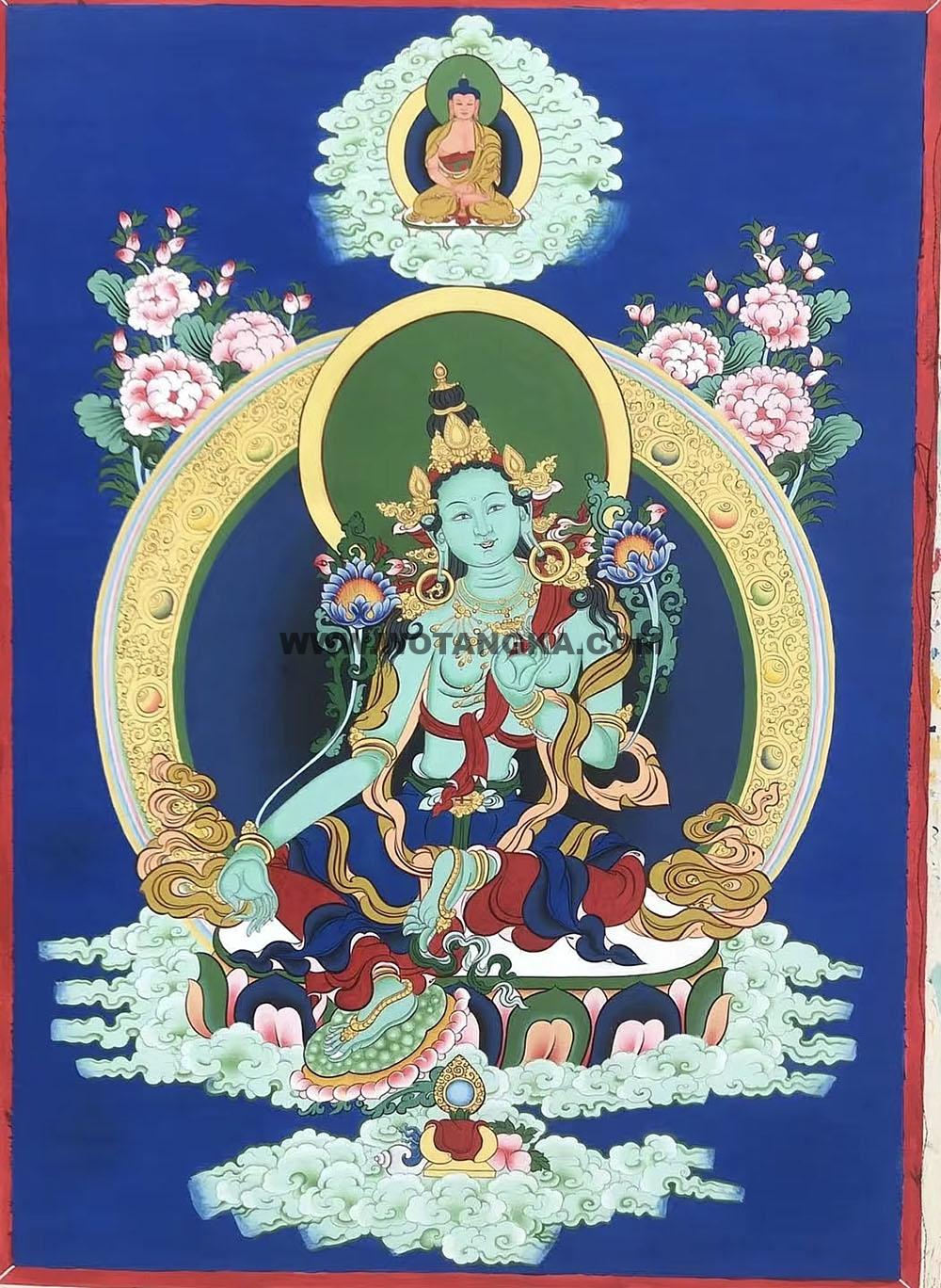 绿度母,梵名Tara,全称圣救度佛母。度母有许多不同的化现,包括有二一度母、五百度母等等,皆为观世音菩萨之化身。相传绿度母是由观世音菩萨的眼泪所化现,为所有度母之主尊,总摄其余二十尊化身之所有功德,是慈悲与绝美的象征。
