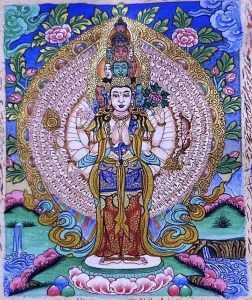 观音曾发誓要普度众生,然而众生芸芸,观音颇有力不胜任之感。于是观音分身成四十二个大慈大悲菩萨,意在利益安乐一切众生。观音的师傅无量佛见状,劝其不要急躁,否则欲速则不达。无量佛将四十二个个体撮合在一起,只留下四十二只手臂,又让每只手掌上长出一只眼睛,代表一个化身。这样除去主体的两只手臂,还有四十只手臂,每只手臂各配上佛门三界中的“二十五有”(佛教认为,三界中有二十五种有情存在环境,包括四洲、四意趣、六欲天等),两数相乘为一千。