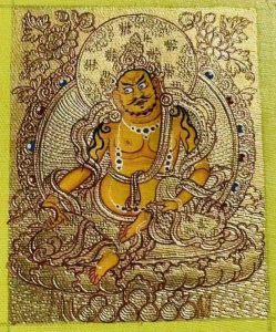 黄瞻巴拉即黄财神:《瞻巴拉修炼方便》中载:宝贝座上雄狮立,莲花宝贝放光芒,方便犹如日月辉,此为财神阿尔亚瞻巴拉。该神身黄挺肚,以绸缎宝贝作装饰;头戴宝冠,花卉耳饰和项链;臂戴臂镯,足饰足镯;上身着衣下身裙,以财运之神而傲立,三目愤怒注视左前方;右手持宝珠置于胸前,左手持吐宝兽置于膝上;两足伸缩有致甚庄严。