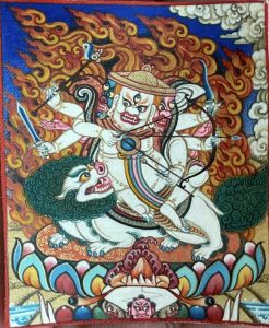 白哈尔意之王,又称意明王护法,本名帝释。他位处中央,是主神,有时也有白哈尔本身居中的形式。他一身蓝黑色,一面二手,呲牙咧嘴,右手持绳套,左手执利刃,身着熊皮外套和黑丝披风,头戴黑丝头饰,骑一头长鼻白象。他的前面有门普布查牵象和大夜叉命主杨来白骑马导引。他的明妃叫响帝若散玛。
