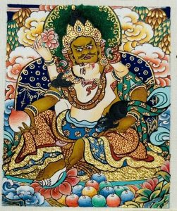 为令密乘行者有资财宏法利生,不被生活所逼,可安心向道,特赐予行者财利丰足。黄财神一面二臂,五佛冠为头饰,矮小肚大,双臂劲力,右手持布拉噶如意宝,左手提着吐宝鼠,身着天衣,蓝莲花及珠宝璎珞作装饰,胸前挂念珠。左足屈,右足踩着海螺宝,以如意姿安座于莲花月轮之上。 黄财神是藏传佛教各大教派普遍供养的五姓财神之一,因其身相黄色,故称黄财神。修持黄财神法、持诵其密咒,可获得黄财神庇佑,能增长福德、寿命、智能、物质及精上之受用,不被生活所逼,以及一切经济压迫,可安心向道。但修法者需发无上菩提心,广结善缘,勤行布施。万勿悭贪成性,护法降罪也. 黄财神即黄布禄金刚,黄财神面慈目善,头戴宝冠,坦胸露腹,戴着珍宝璎珞、珍宝耳环、珍宝手镯和珍宝足钏,上身穿丝制天衣,下身着丝制裙子,右手于右膝上捧喷焰末尼,左手握着吐宝鼬,以威镇坐姿坐在莲花宝座中央。身后有光环、祥云、远山。能增长福德、寿命、智慧、物质及精神上之受用。主司财富,能使一切众生脱于贫困,财源广进。