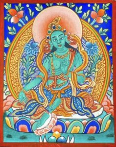 绿度母坐菩萨座于莲花月轮上,双脚屈左展右,左腿单坐,右腿向下舒展,踏在莲花上表示随时准备起身救度苦难众生,如慈爱的母亲一般,拯救钟爱的孩子;