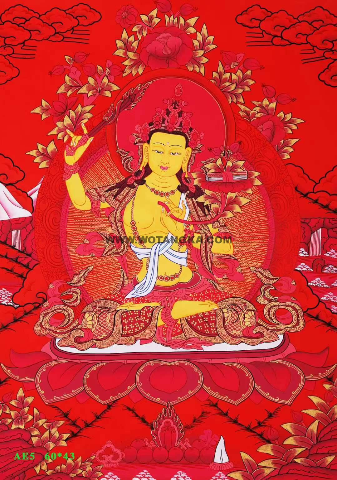 尼泊尔传统唐卡–【文殊菩萨】手绘布本。采用K真金描线,天然矿石颜料着色晕染,画工细腻,开脸殊胜,喜欢不要错过。