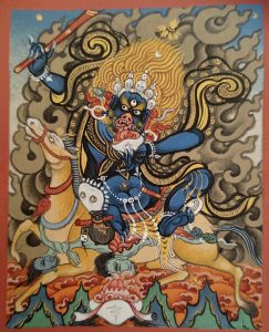 吉祥天母又称吉祥天女,梵文Laksmī,音译拉娔诗米,藏语称班达拉姆,是藏密中一个重要女性护法神。她是古印度神话中的人物,传说是天神和仇敌阿修罗搅动乳海时诞生的。后来婆罗门教和印度教把她塑造成女神,为她取名功德天女(又称吉祥天女),她是毗湿奴的妃子,财神毗沙门之妹,主司命运和财富。后来她成了佛教的重要护法神。
