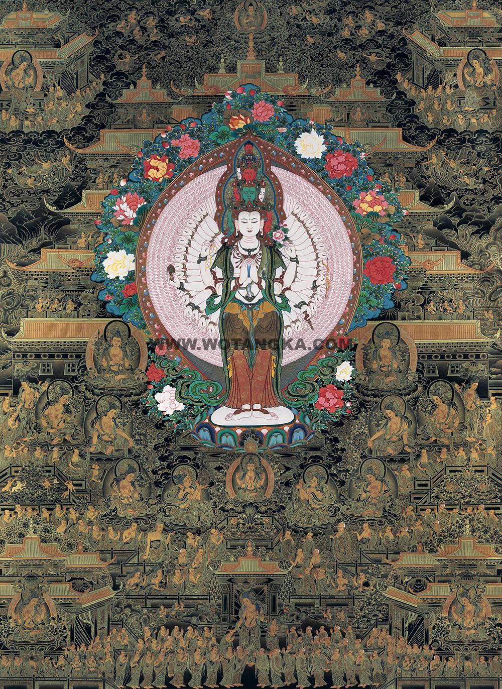 编号188-723159:黑金唐卡-千手观音·普陀净土(150*95CM左右) | 沃唐卡www.WoTangKa.com