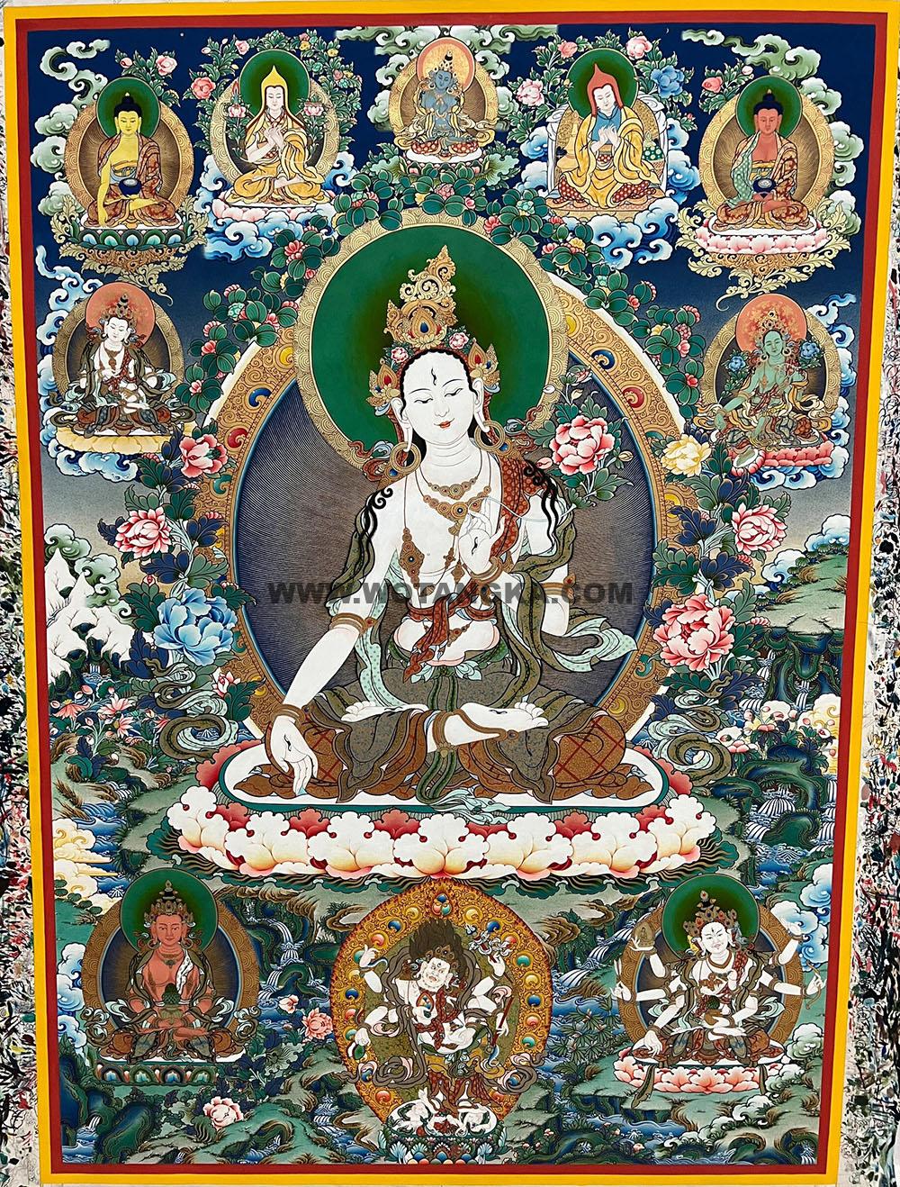 唐卡作品名称:白度母长寿尊白如意怙主护法诸天佛界上师吉祥供养图