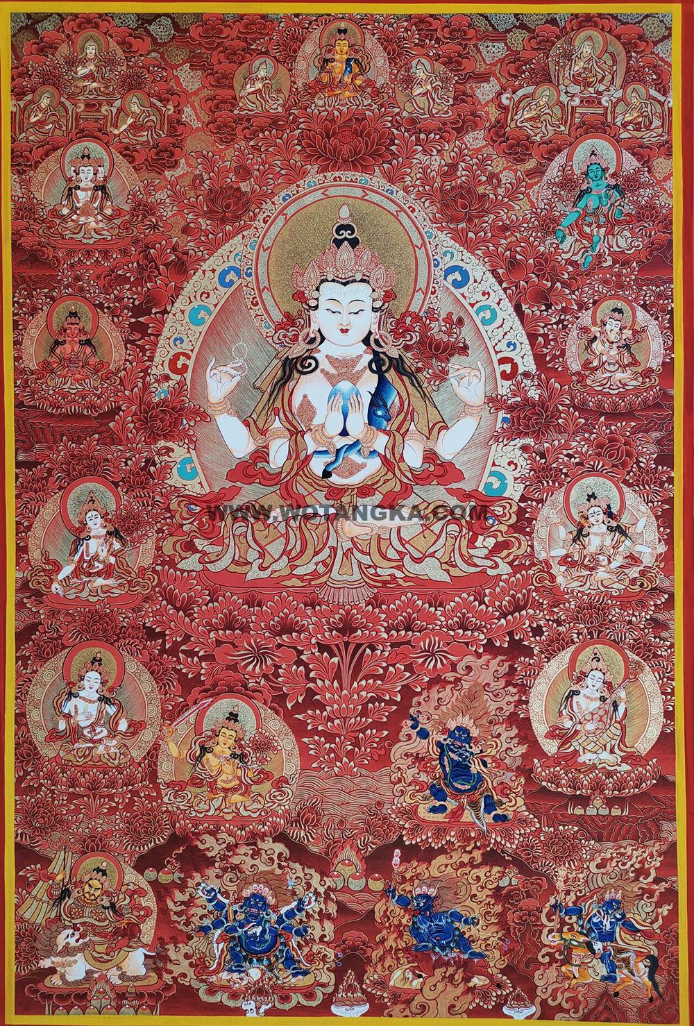 编号188-959478:红金唐卡-四臂观音·三怙主(100*70CM左右) | 沃唐卡www.WoTangKa.com