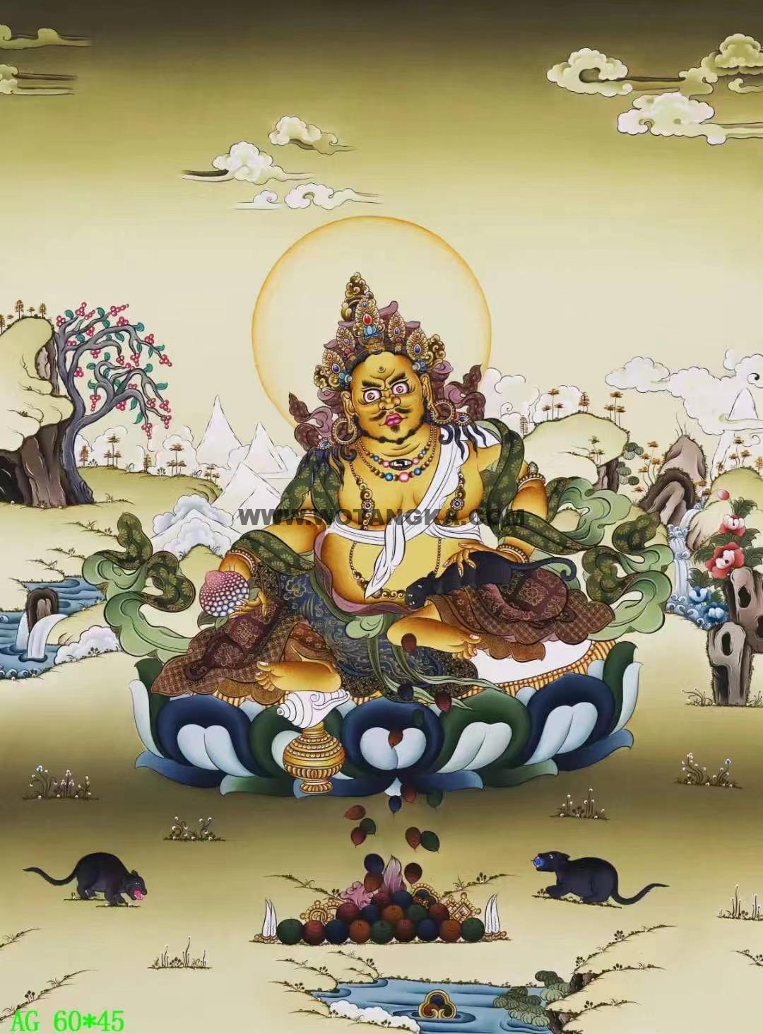 嘎玛嘎赤画派精品唐卡,成名嘎玛嘎赤画派唐卡大师亲工作品手绘唐卡《黄财神》。采用24K金与天然矿物颜料绘制,为噶玛噶孜风格唐卡,整体色彩柔和温润,体现了画师高超的晕染技艺,唐卡中主尊黄财神呈站姿位于中央,右手持摩尼宝,左手持吐宝鼠,下方两尊分别为白财神与财神,各尊开脸法相殊胜,站姿黄财神唐卡十分少见,精品的更是少之又少,这幅唐卡值得珍藏!