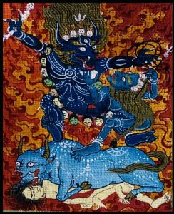 外修阎罗肤色蔚蓝,赤身露体,体型矮胖,大腹低垂。一面二臂,为忿怒牛面,上有二角,锋利无比。三目圆睁,血盆之口大张,暴出四颗獠牙。须眉似火,赤发上冲。右手持骷髅杖,左手握缚魔索,以右蜷左展之势踏立于青蓝忿怒水牛脊骨之上。旁边“杂母支”母身色蓝黑,一面二臂,右手持三尖叉,左手持盛血颅器,仰视阎罗。也站立于凶暴水牛脊背之上。此“外阎罗”即居于南方七层地下,掌管一切生命轮回之狱主,为护持业果教法及下士道之护法。